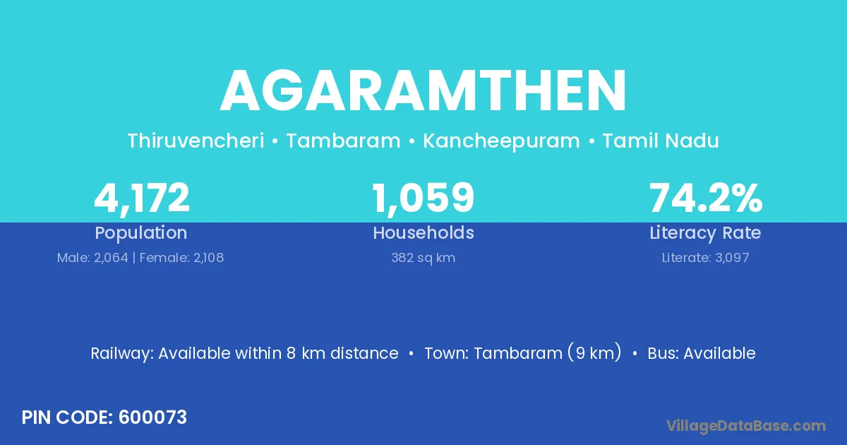 According to Census 2011 information, the village code of Agaramthen village is 600073.