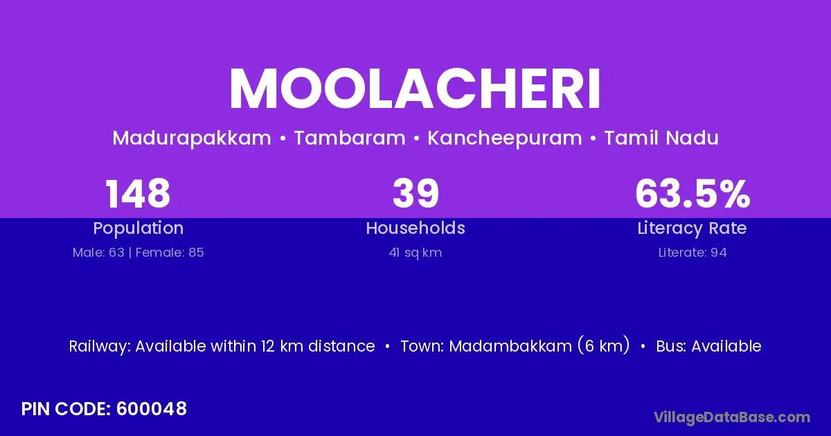 Madambakkam (6 km) is the nearest town to Moolacheri village for major economic activities and is located approximately 6 km away.