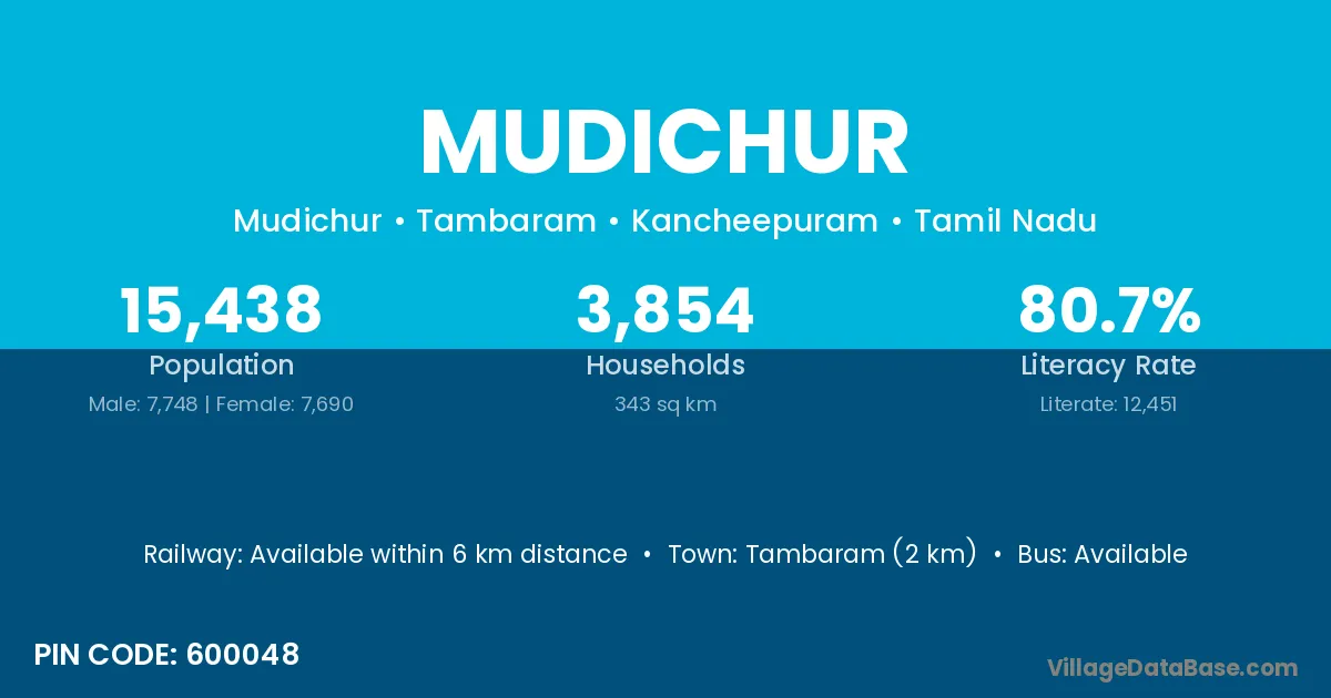 Tambaram (2 km) is the nearest town to Mudichur village for major economic activities and is located approximately 2 km away.