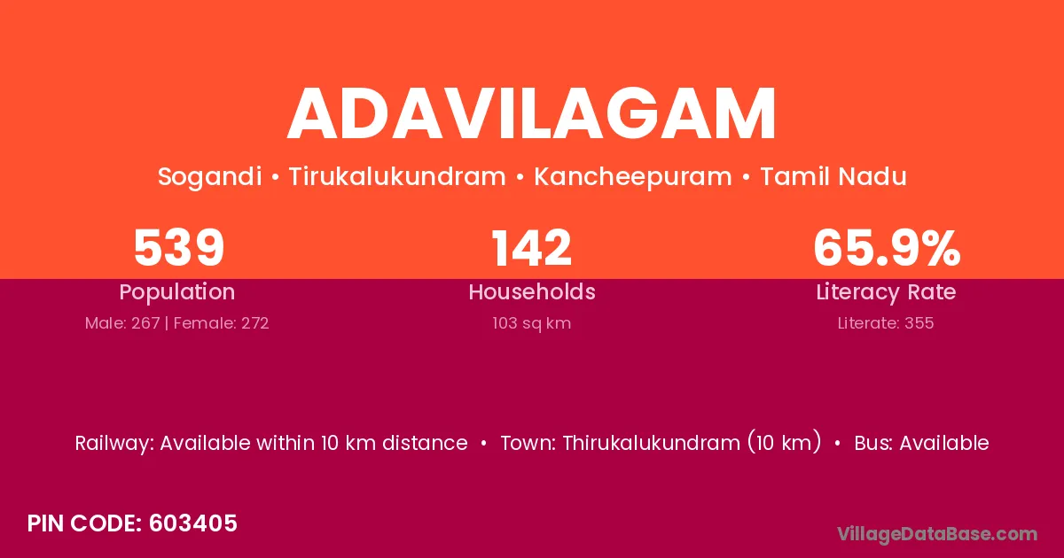 Adavilagam village has a total population of 539 people, of which 267 are males and 272 are females.