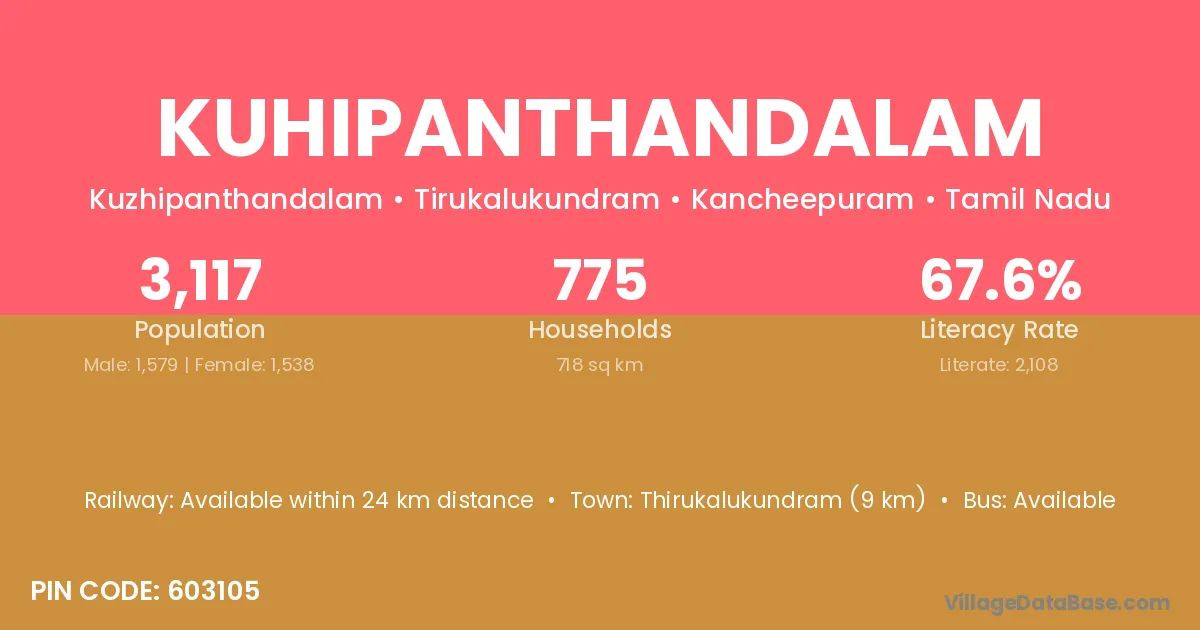 Kuhipanthandalam village has a total population of 3,117 people, of which 1,579 are males and 1,538 are females.