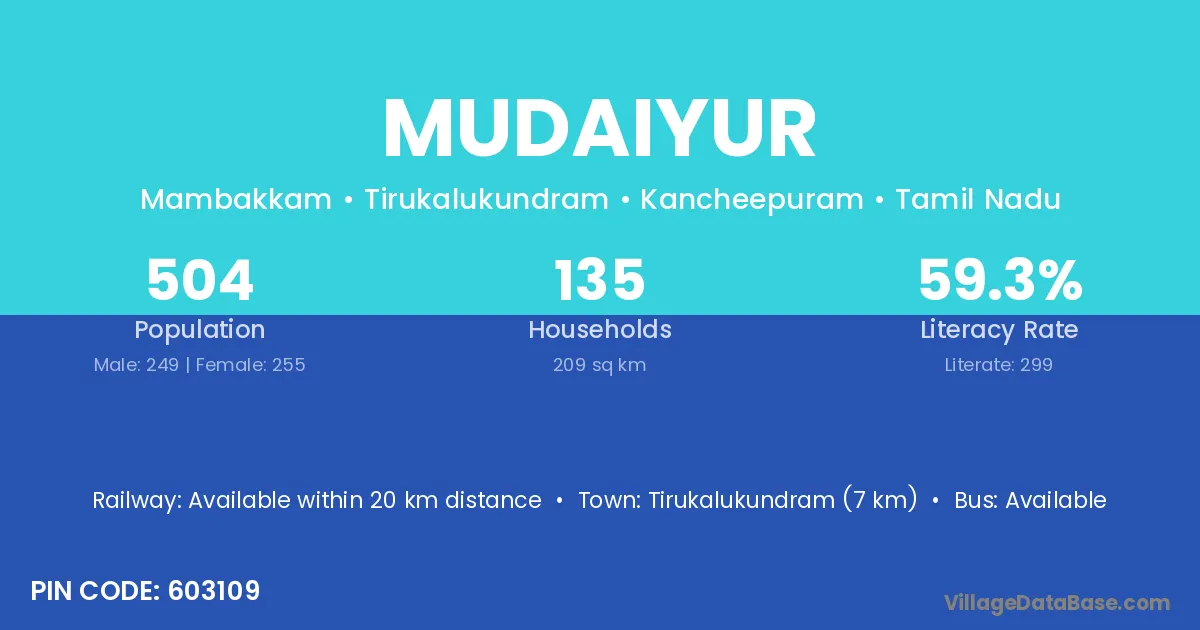 Mudaiyur village has a total population of 504 people, of which 249 are males and 255 are females.