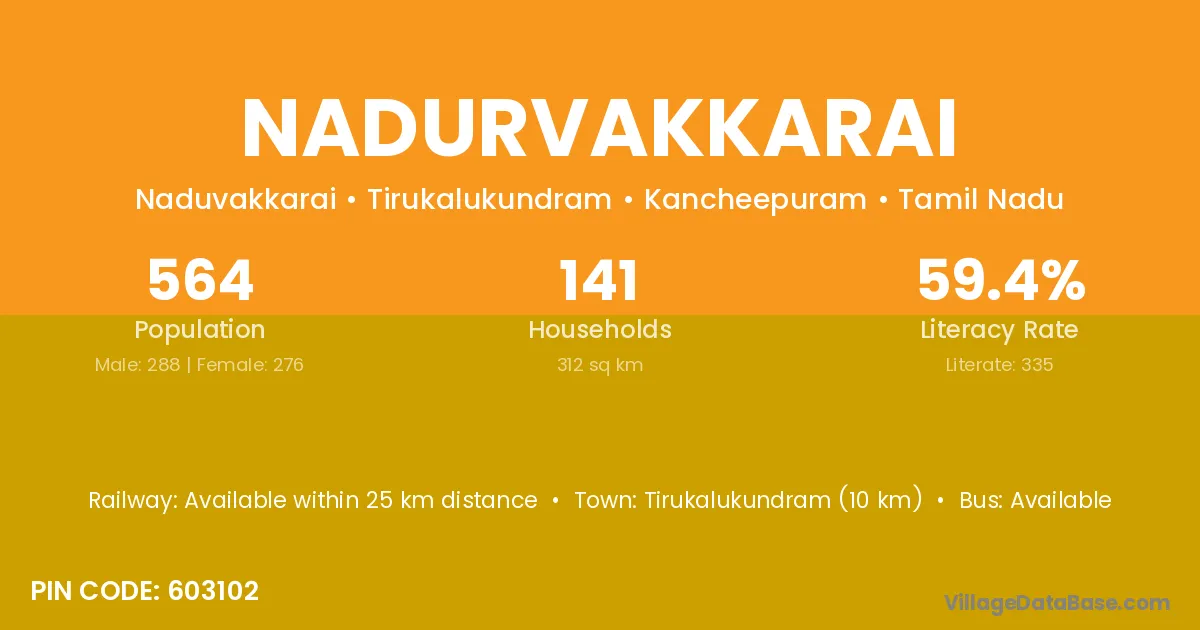 Nadurvakkarai village has a total population of 564 people, of which 288 are males and 276 are females.