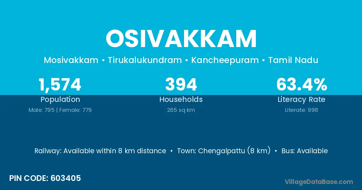 Osivakkam village has a total population of 1,574 people, of which 795 are males and 779 are females.
