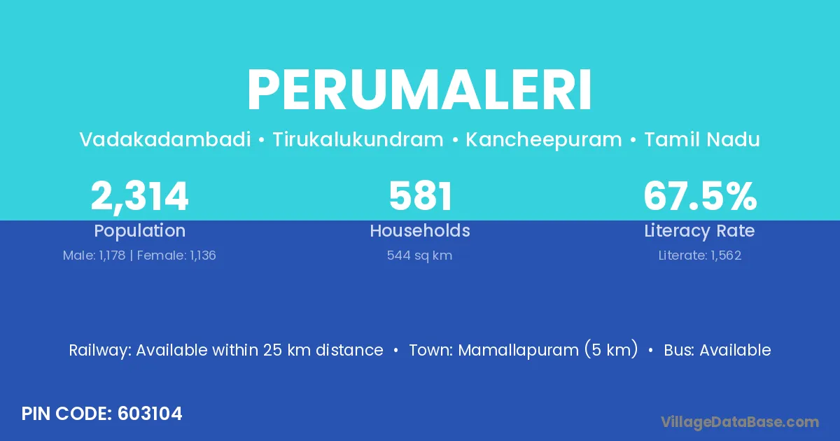 Mamallapuram (5 km) is the nearest town to Perumaleri village for major economic activities and is located approximately 5 km away.