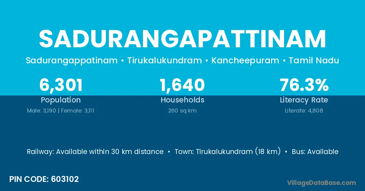 Tirukalukundram (18 km) is the nearest town to Sadurangapattinam village for major economic activities and is located approximately 18 km away.