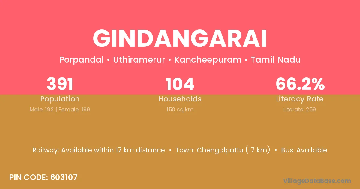 Chengalpattu (17 km) is the nearest town to Gindangarai village for major economic activities and is located approximately 17 km away.