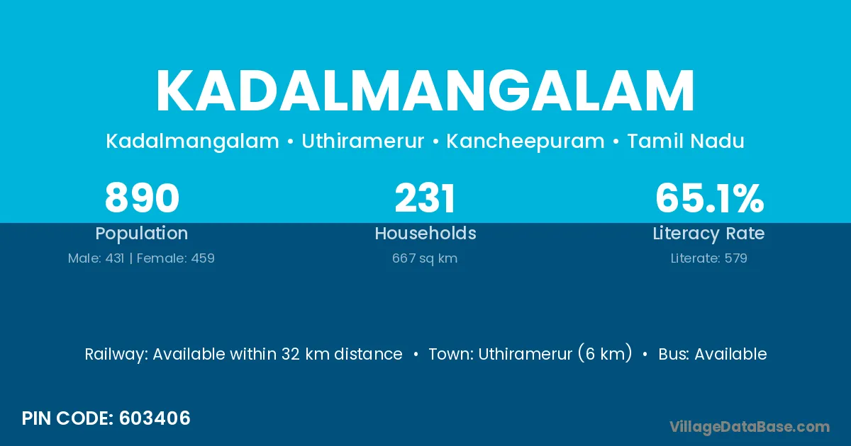 Uthiramerur (6 km) is the nearest town to Kadalmangalam village for major economic activities and is located approximately 6 km away.
