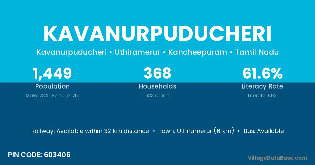 Kavanurpuducheri village has a total population of 1,449 people, of which 734 are males and 715 are females.
