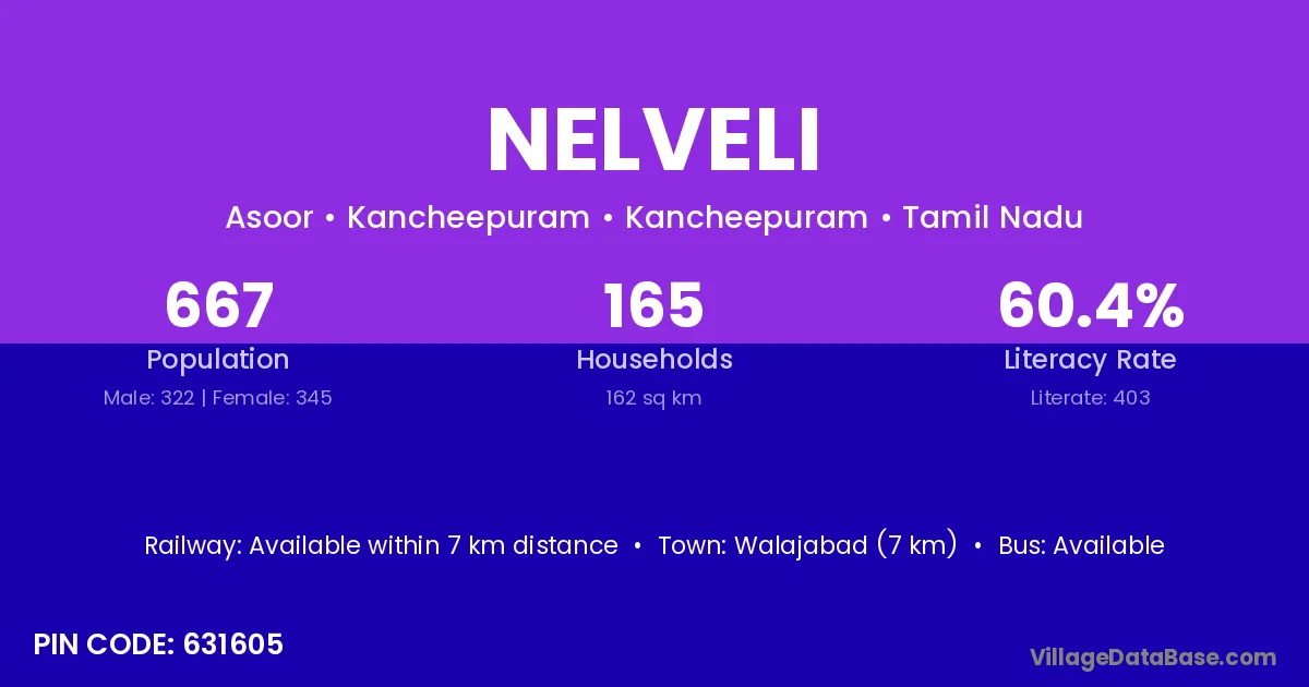 Uthiramerur (12 km) is the nearest town to Nelveli village for major economic activities and is located approximately 12 km away.