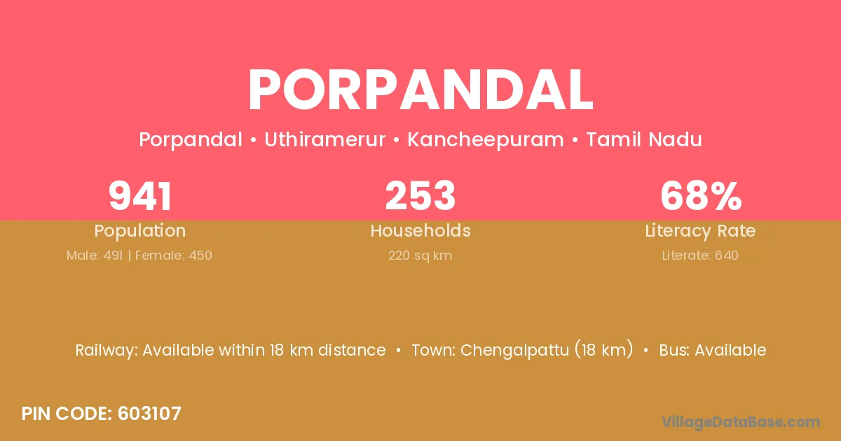 Chengalpattu (18 km) is the nearest town to Porpandal village for major economic activities and is located approximately 18 km away.