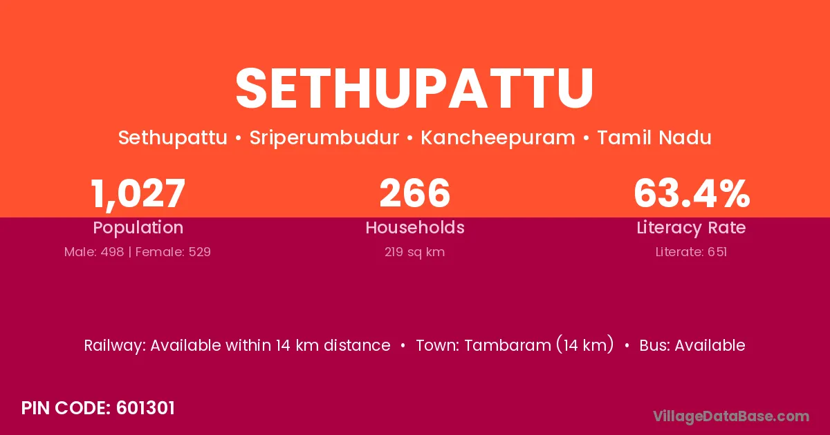 Uthiramerur (15 km) is the nearest town to Sethupattu village for major economic activities and is located approximately 15 km away.