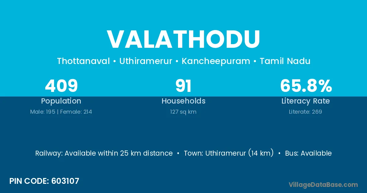 Uthiramerur (14 km) is the nearest town to Valathodu village for major economic activities and is located approximately 14 km away.
