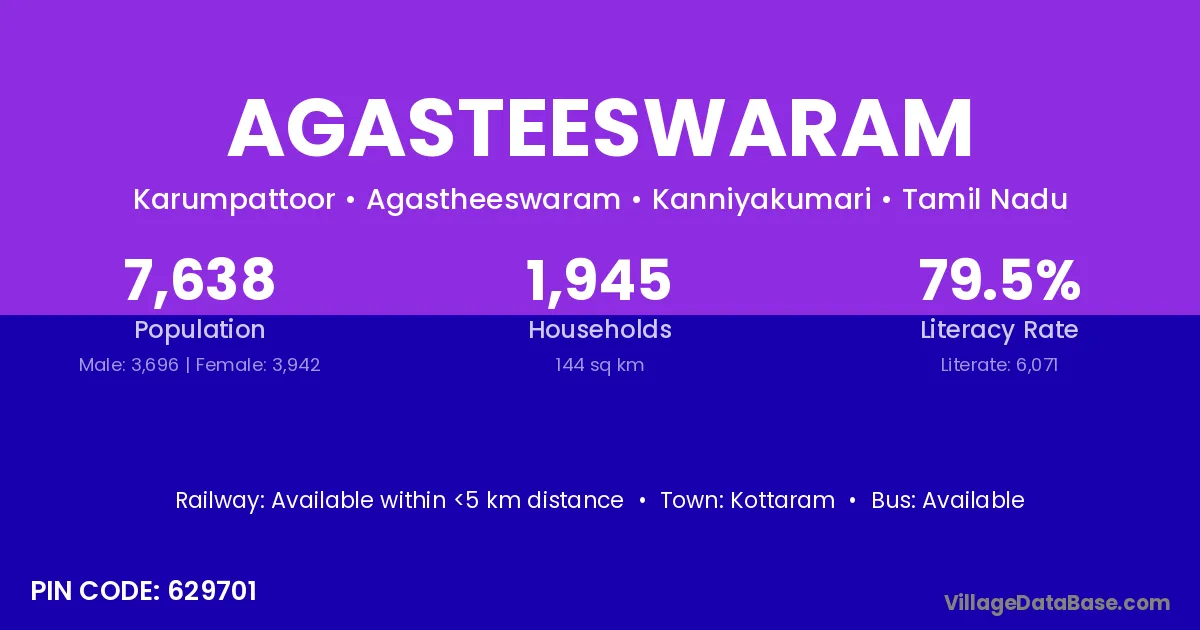 Agasteeswaram village has a total population of 7,638 people, of which 3,696 are males and 3,942 are females.