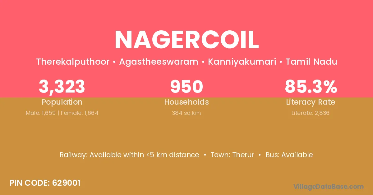 Nagercoil village has a total population of 3,323 people, of which 1,659 are males and 1,664 are females.