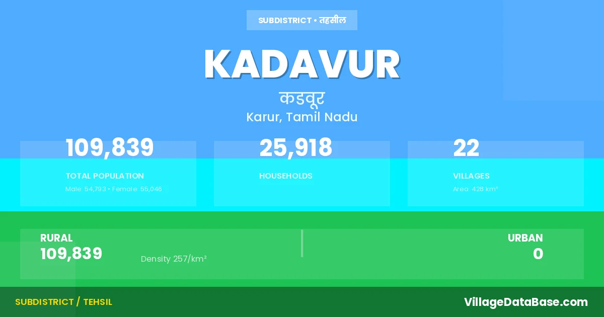 According to the 2011 census The total area of Kadavur Taluka is 428 km², with a population of 109839 people. The population density is 257 inhabitants per square kilometre, and there are approximately 25918 houses in the sub district.