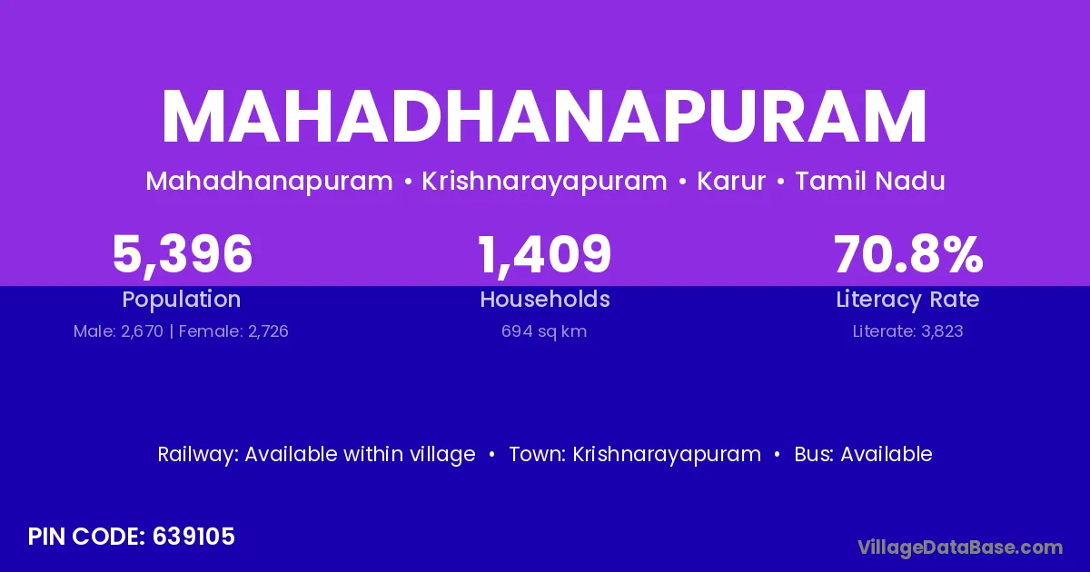 Mahadhanapuram village has a total population of 5,396 people, of which 2,670 are males and 2,726 are females.