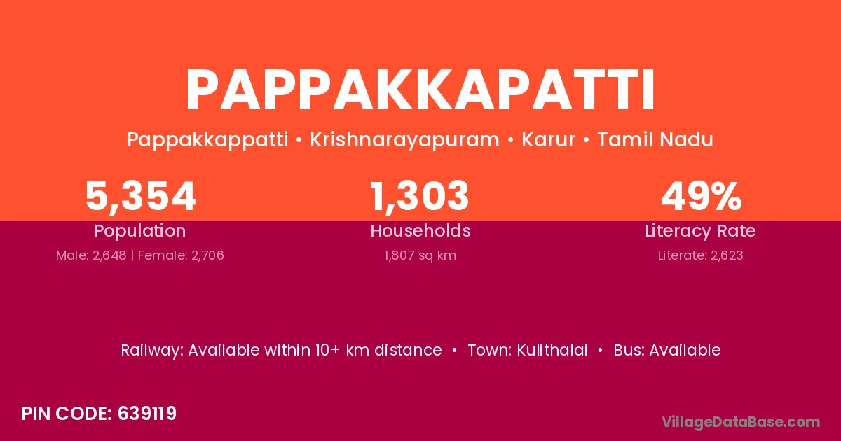 Pappakkapatti village has a total population of 5,354 people, of which 2,648 are males and 2,706 are females.