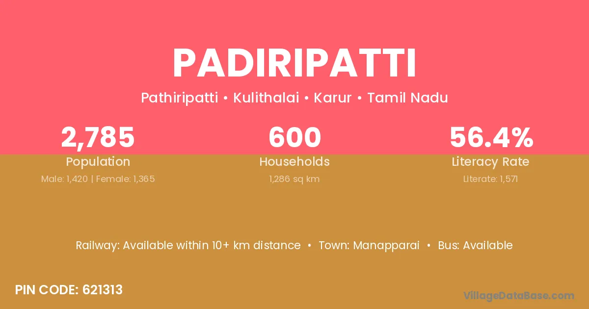 Padiripatti village has a total population of 2,785 people, of which 1,420 are males and 1,365 are females.