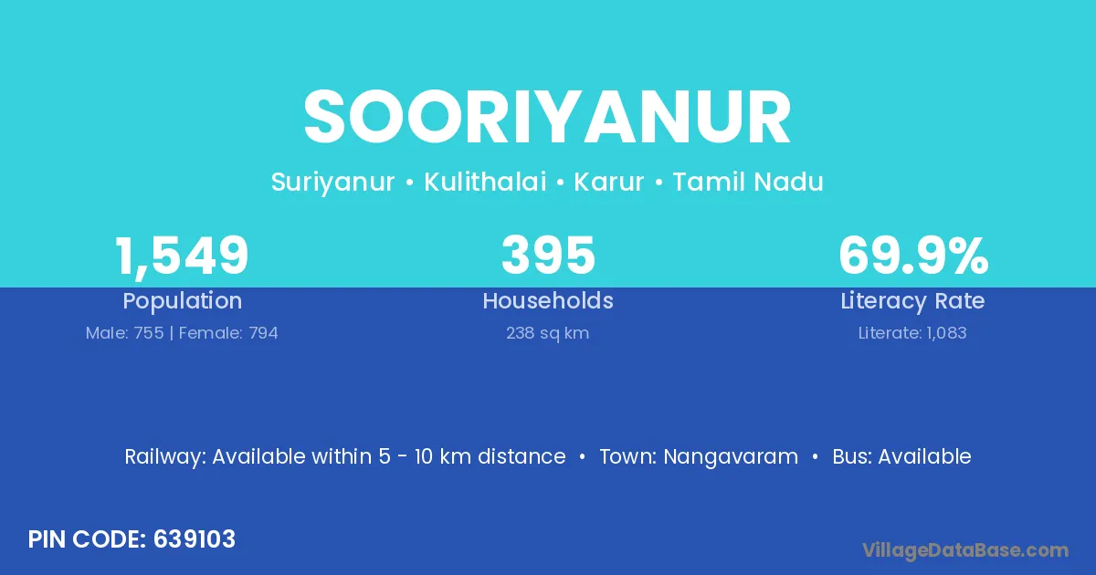 According to Census 2011 information, the village code of Sooriyanur village is 639103.
