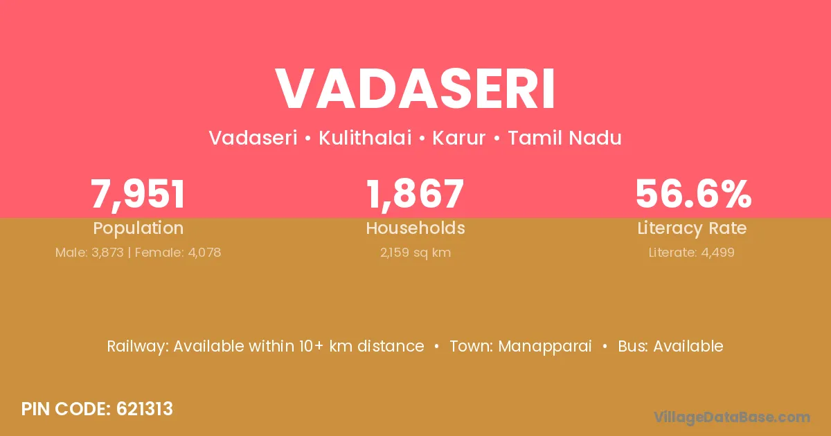Vadaseri village has a total population of 7,951 people, of which 3,873 are males and 4,078 are females.