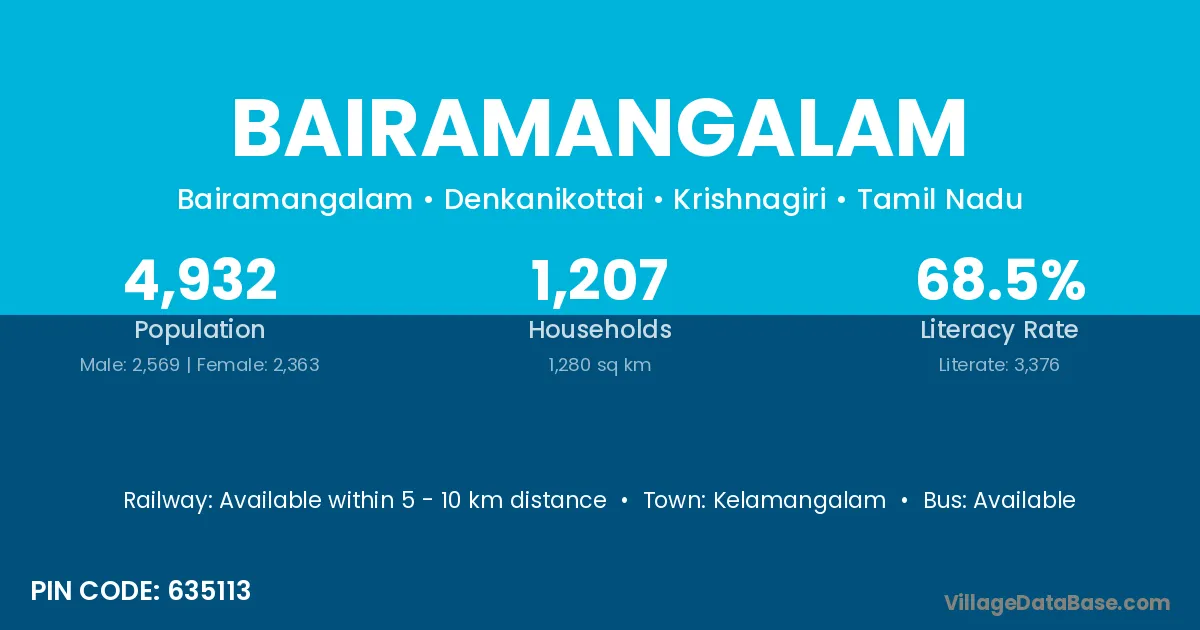 Kelamangalam is the nearest town to Bairamangalam village for major economic activities