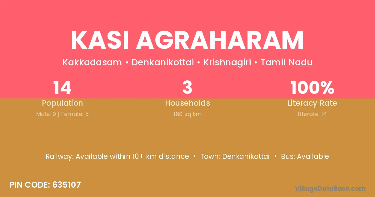 Kasi Agraharam village has a total population of 14 people, of which 9 are males and 5 are females.
