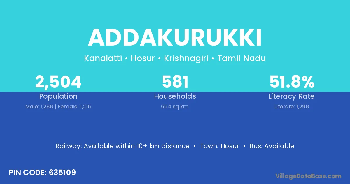 Addakurukki village has a total population of 2,504 people, of which 1,288 are males and 1,216 are females.