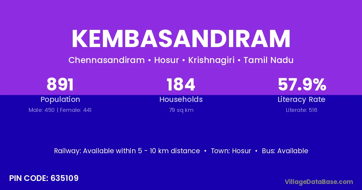 Kembasandiram village has a total population of 891 people, of which 450 are males and 441 are females.