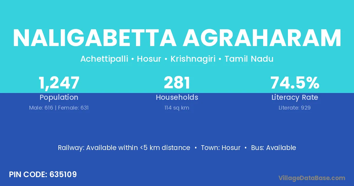 Naligabetta Agraharam village has a total population of 1,247 people, of which 616 are males and 631 are females.