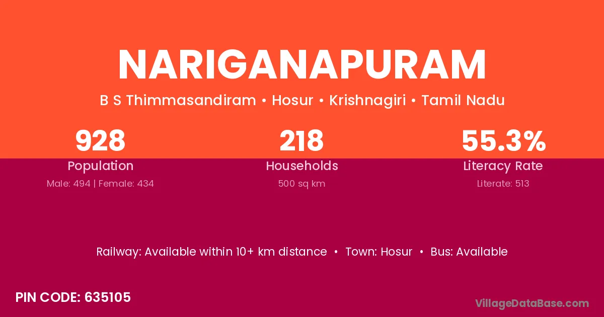 Hosur is the nearest town to Nariganapuram village for major economic activities