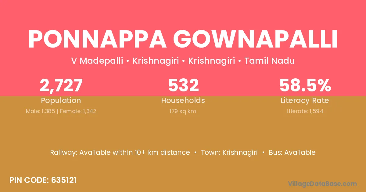 According to Census 2011 information, the village code of Ponnappa Gownapalli village is 635121.