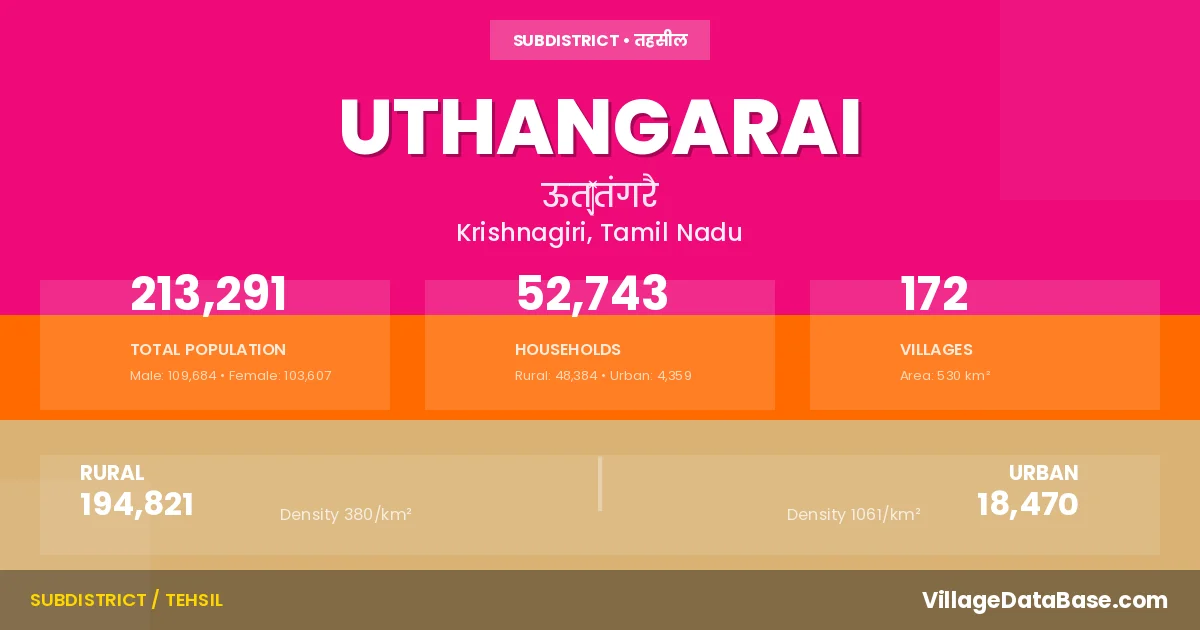 According to the 2011 census The total area of Uthangarai Taluka is 530 km², with a population of 213291 people. The population density is 402 inhabitants per square kilometre, and there are approximately 52743 houses in the sub district.