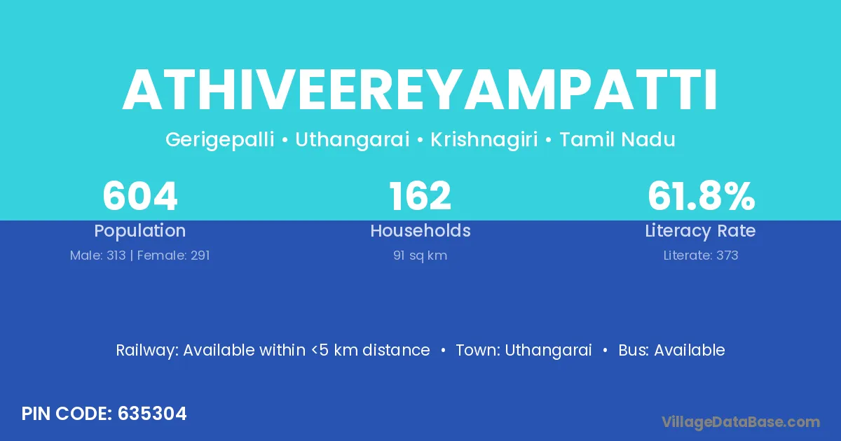 Athiveereyampatti village has a total population of 604 people, of which 313 are males and 291 are females.