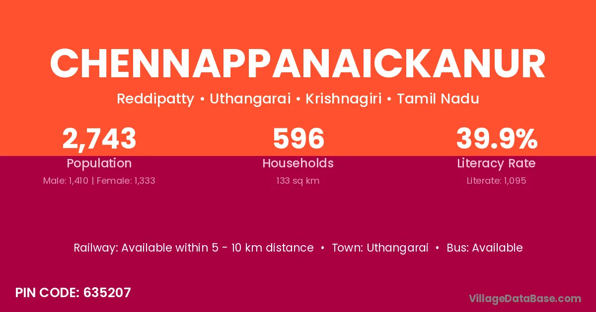 Chennappanaickanur village has a total population of 2,743 people, of which 1,410 are males and 1,333 are females.