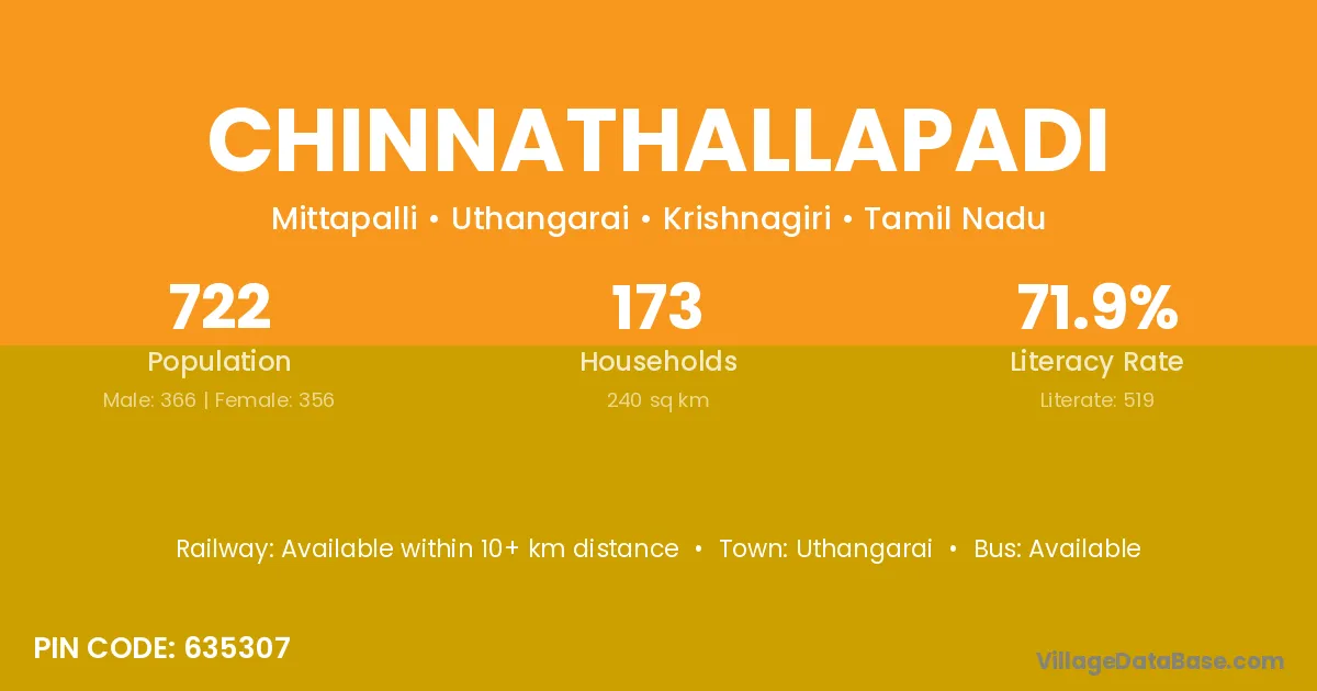 Chinnathallapadi village has a total population of 722 people, of which 366 are males and 356 are females.