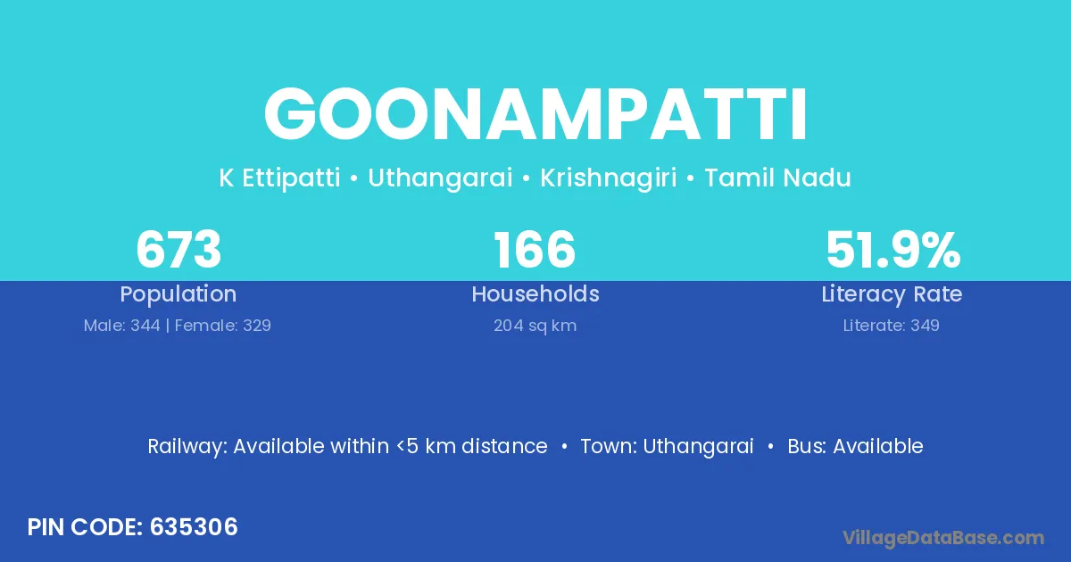 Goonampatti village has a total population of 673 people, of which 344 are males and 329 are females.