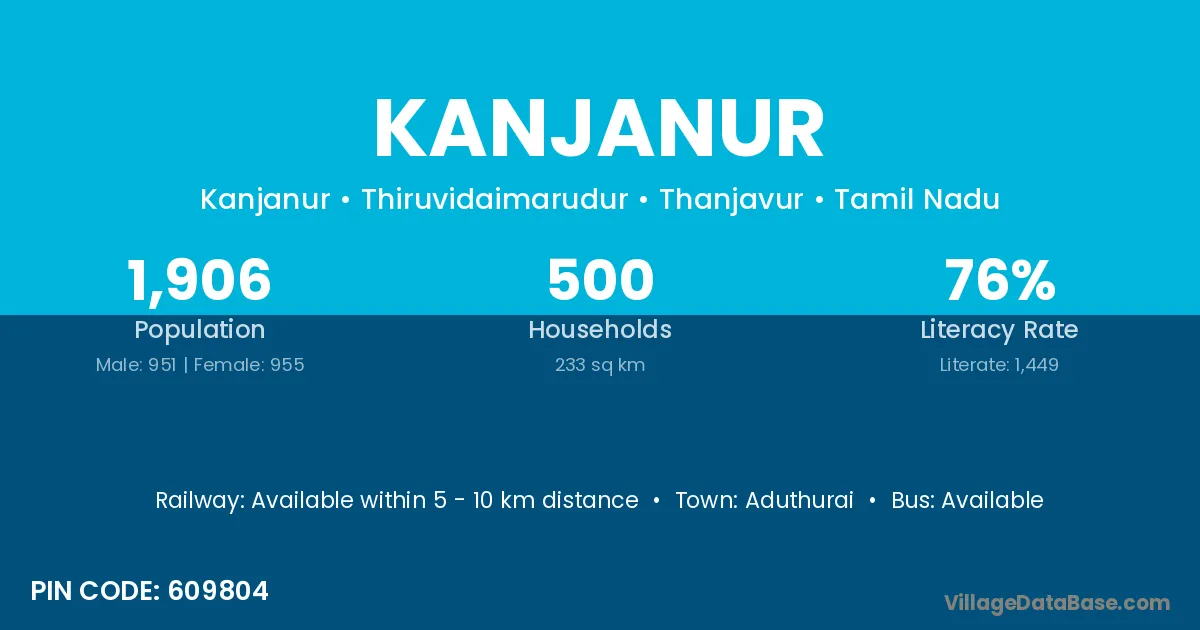 The literacy rate of Kanjanur village is 67.01%. Male literacy stands at 72.23% and female literacy at 61.24%.