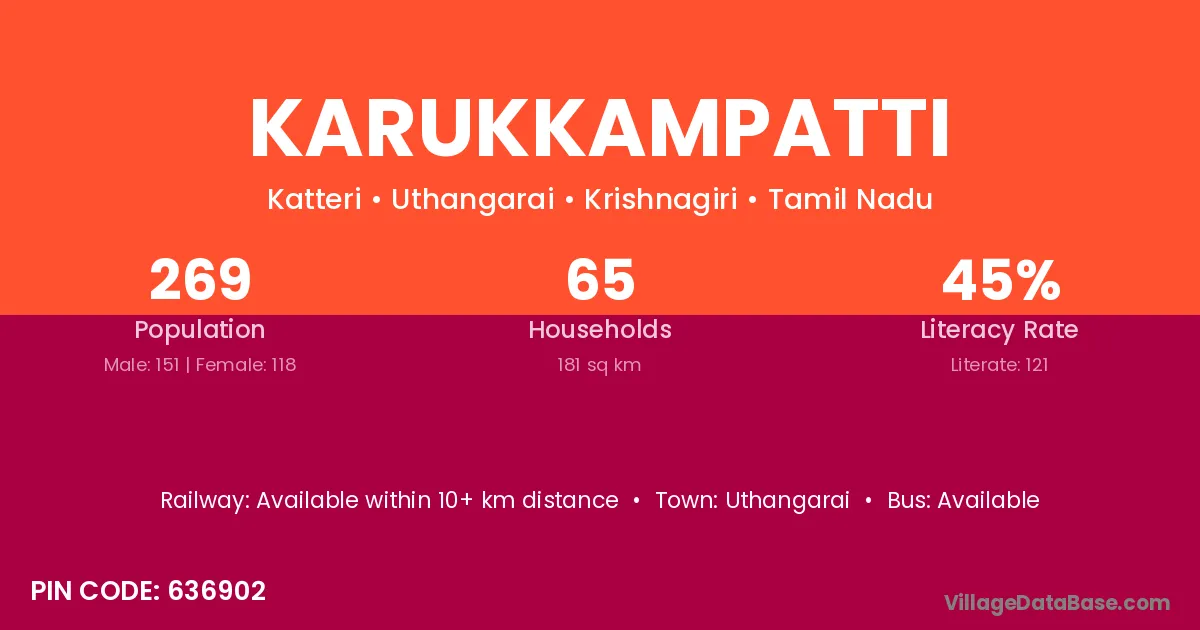 Karukkampatti village has a total population of 269 people, of which 151 are males and 118 are females.