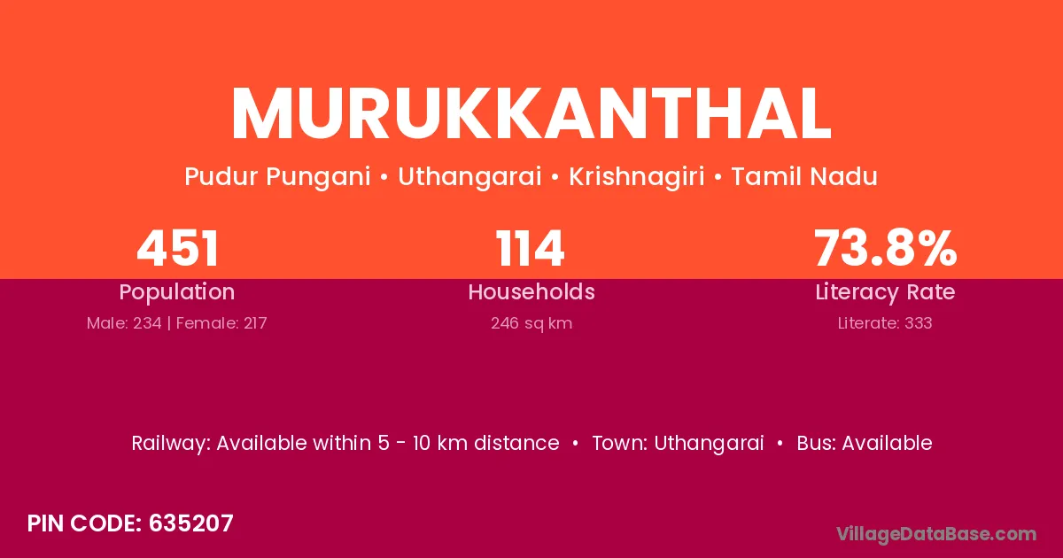 Murukkanthal village has a total population of 451 people, of which 234 are males and 217 are females.