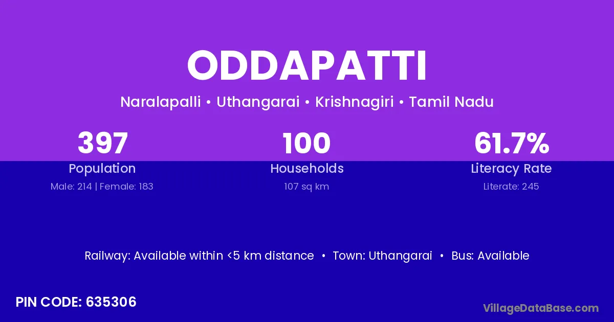 Oddapatti village has a total population of 397 people, of which 214 are males and 183 are females.