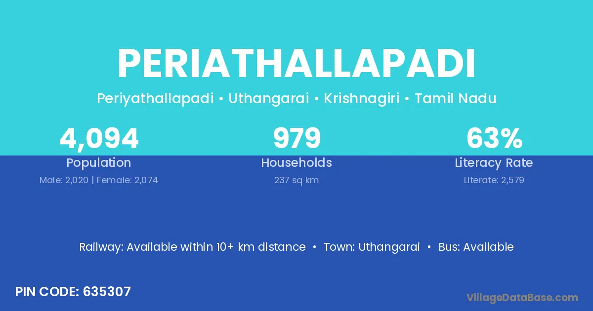 Periathallapadi village has a total population of 4,094 people, of which 2,020 are males and 2,074 are females.