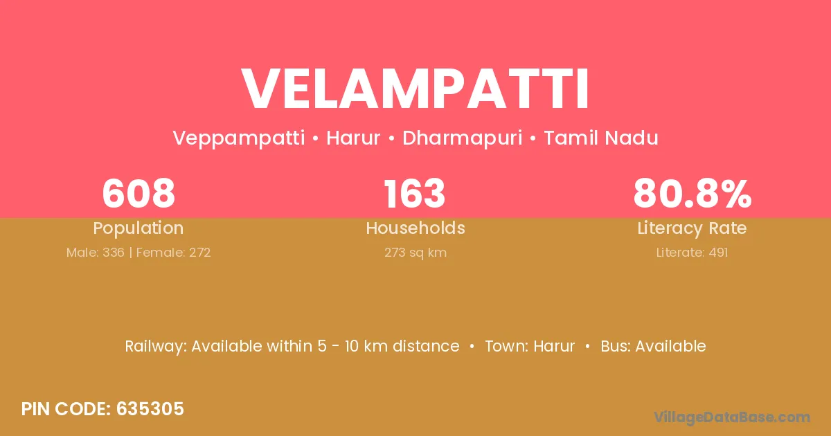 The literacy rate of Velampatti village is 62.85%. Male literacy stands at 69.64% and female literacy at 55.56%.