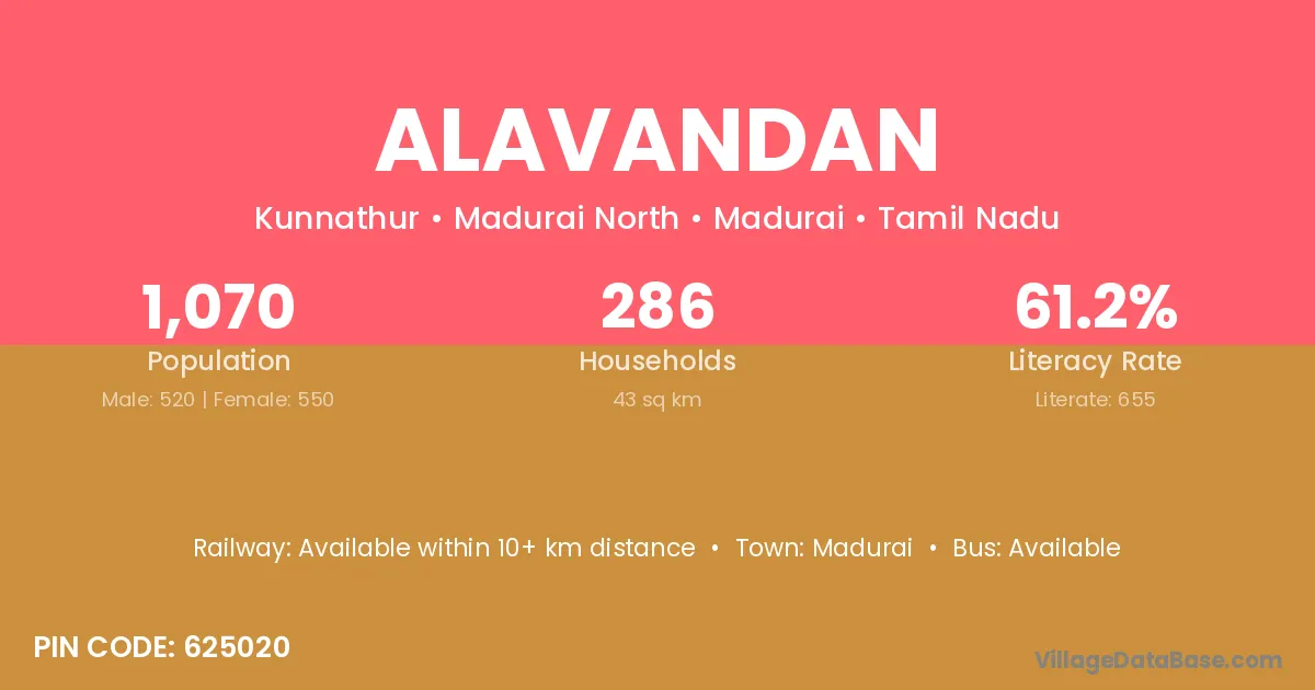 According to Census 2011 information, the village code of Alavandan village is 625020.