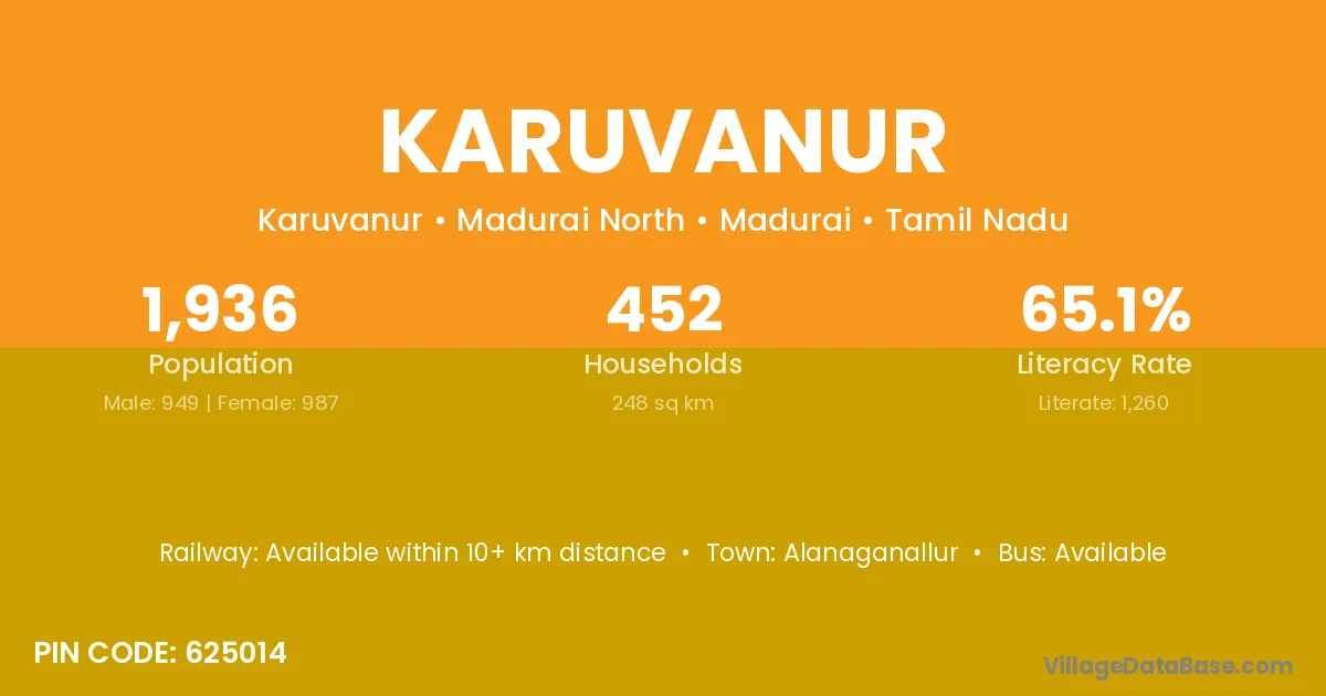 Karuvanur village has a total population of 1,936 people, of which 949 are males and 987 are females.