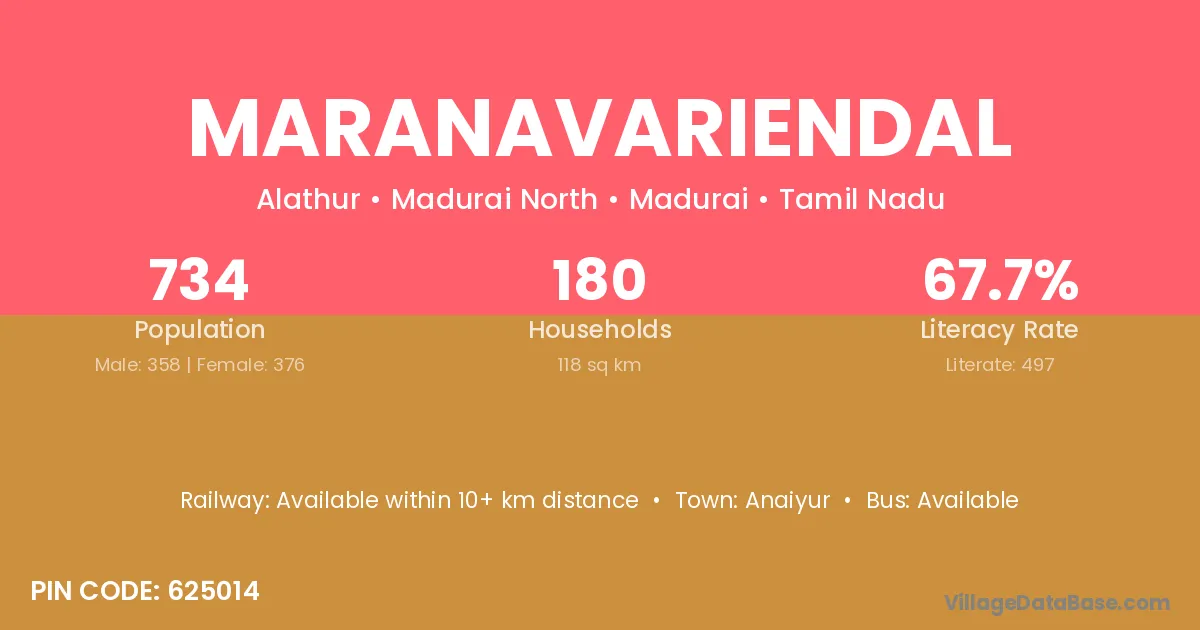 Maranavariendal village has a total population of 734 people, of which 358 are males and 376 are females.