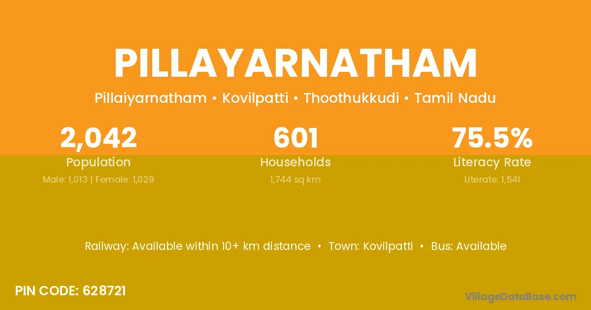 According to Census 2011 information, the village code of Pillayarnatham village is 625402.