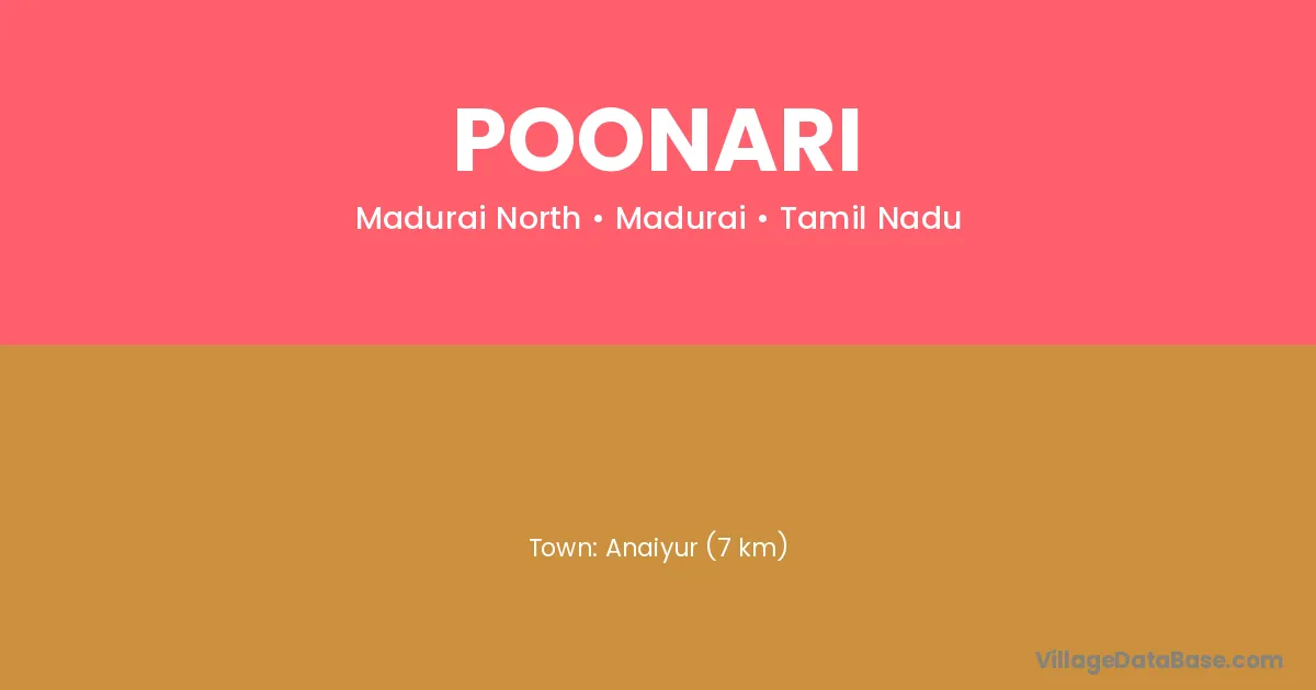 Anaiyur (7 km) is the nearest town to Poonari village for major economic activities and is located approximately 7 km away.