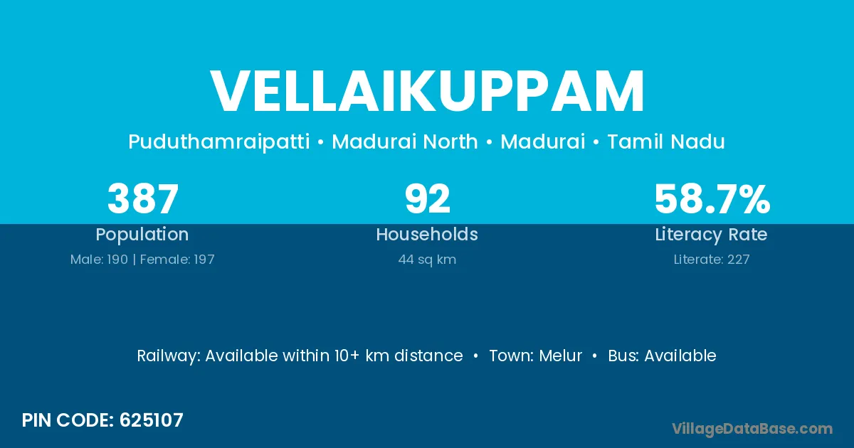 Melur is the nearest town to Vellaikuppam village for major economic activities