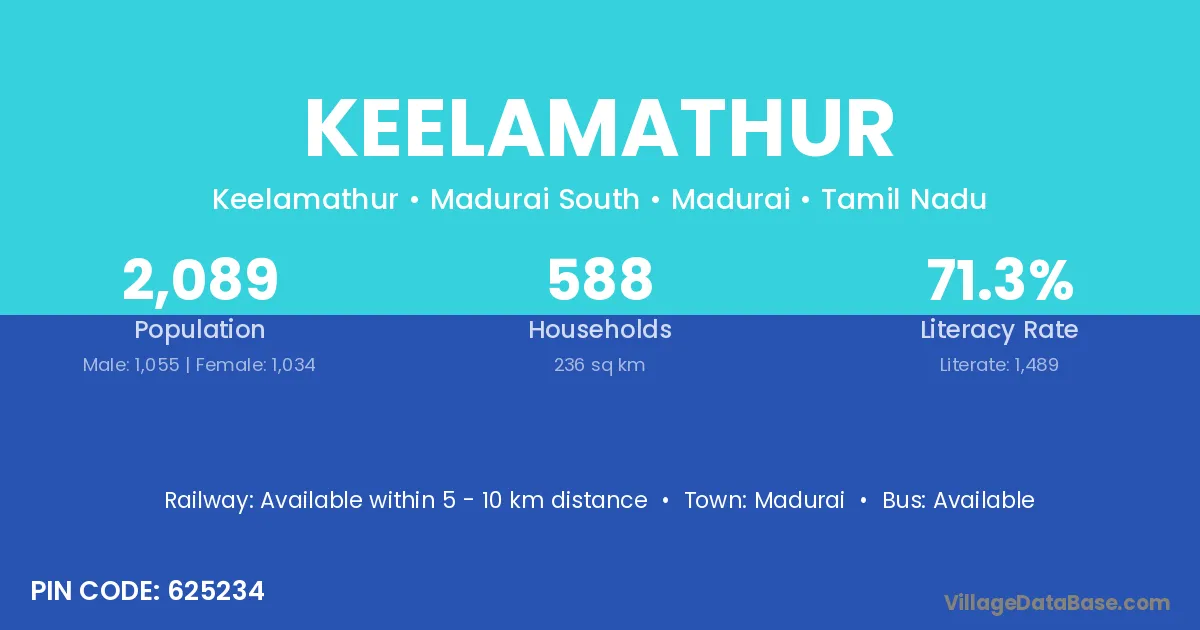 Keelamathur village has a total population of 2,089 people, of which 1,055 are males and 1,034 are females.